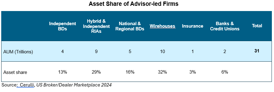 For the latter objective, it is useful to note that currently, per Cerulli estimates, 61% of the $51 trillion in US assets under management is “advisor led,” as opposed to self-directed (Vanguard, Fidelity, etc.) or held in Trust. And only 6% of those assets are managed by bank-based advisors. If, like the general population, bank-based advisor clients who are 70+ own 37% of the advisor’s AUM, the size of the pie they have to defend is $740 billion (i.e., 37% of $2 trillion. Not chump change, but not in the trillions.