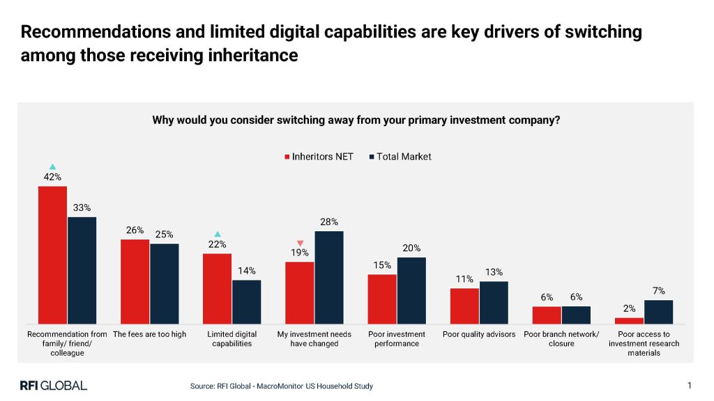 At the Kehrer study group on integrating the delivery of wealth management, Luke Allchin (RFI Global’s Director of Research) and James Langford (Commercial Vice President of the MacroMonitor) pointed out that 30% of the households that expect an inheritance in the coming year are actively looking to change primary financial advisors, frequently evaluate providers, or would think about switching.  What is the key driver of the urge to change?  Among the many reasons someone might change advisors, the lack of digital capabilities stands out.