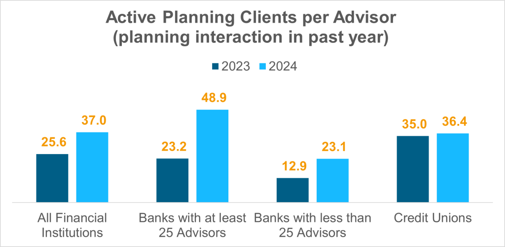 Last year’s increase in advisor planning activity was driven largely by advisors in both the larger and smaller banks, who doubled their average plan engagement. Credit unions, which had the highest number of active planning clients per advisor in 2023, maintained their plan productivity during 2024, but were surpassed by the advisors in the larger banks.