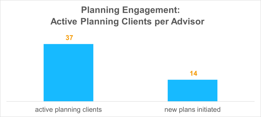 More than one-third of those planning clients had been engaged in planning just this past year, suggesting that we will continue to see robust growth in advisor planning activity. On the other hand, the numbers indicate that, on average, bank-based advisors engaged with only 23 clients whose plans were created in prior years. That’s engaging with only two continuing clients a month on their plan.