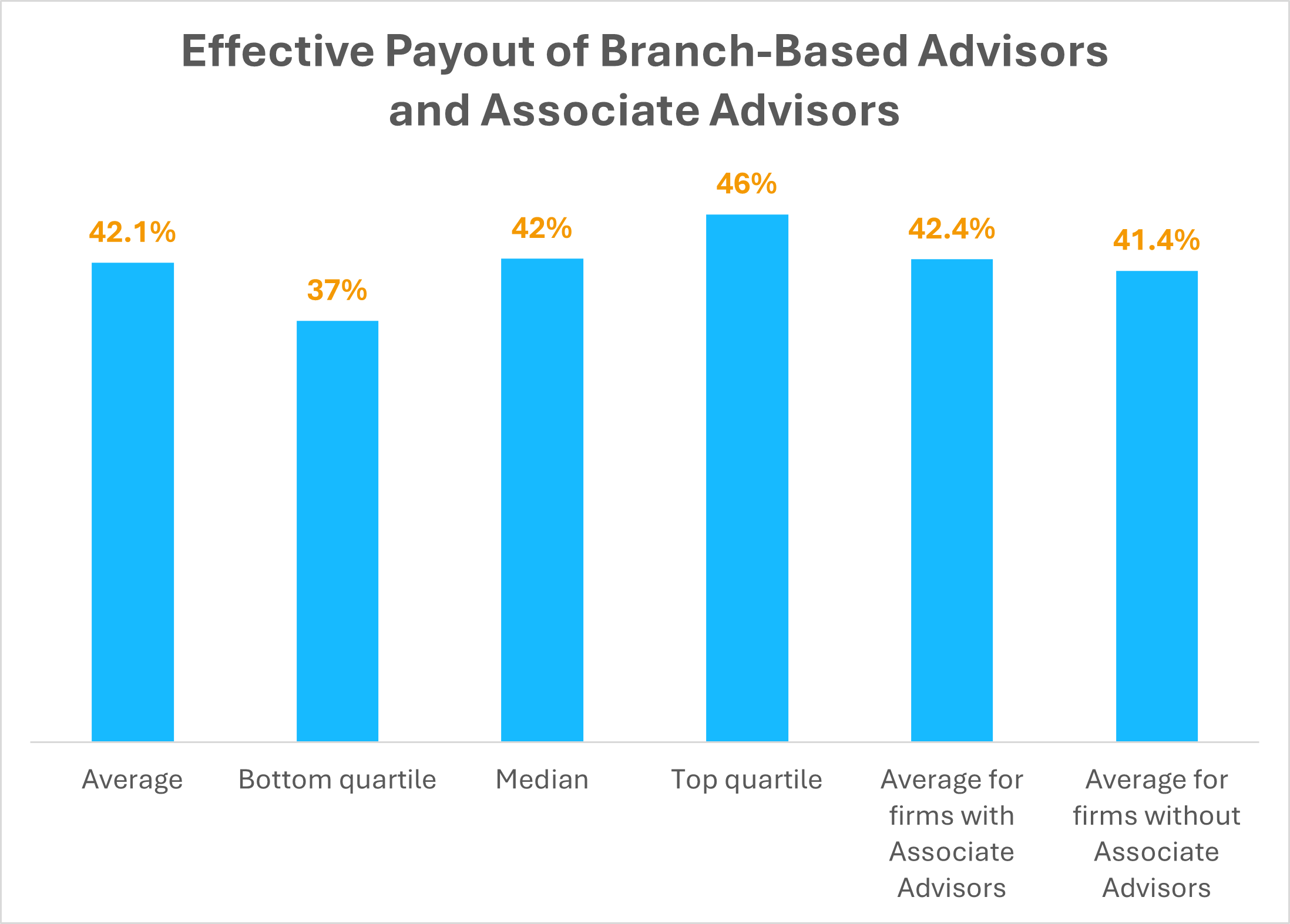 This approach has the added benefit of comparing how much the nurturing of associate advisors costs the bank and credit union financial advice community. Associate advisor programs are the principal approach bank-based firms use to develop advisors. The data suggest that banks and credit unions spend 1 percentage point of revenue on training associate advisors. Firms with associate advisors have effective payouts of the combined branch advisors and their associates of 42.4%, while firms without associates compensate their branch advisors 41.4% of their production.