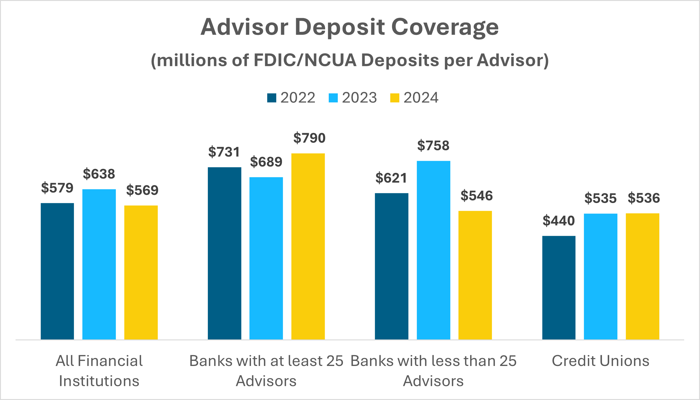 This improvement in advisor deposit coverage was driven by banks with less than 25 financial advisors, which increased advisor headcount by 6.3%. Their 2024 average of $546 million in deposits per advisor is 28% thicker coverage than in 2023. On the other hand, the larger banks lost substantial coverage, even though their advisor forces grew 3.2%. Their ratio of core deposits per advisor worsened 29%, year over year. Credit unions just maintained their advisor deposit coverage after a strong net recruiting year, growing advisor headcount 7.2%
