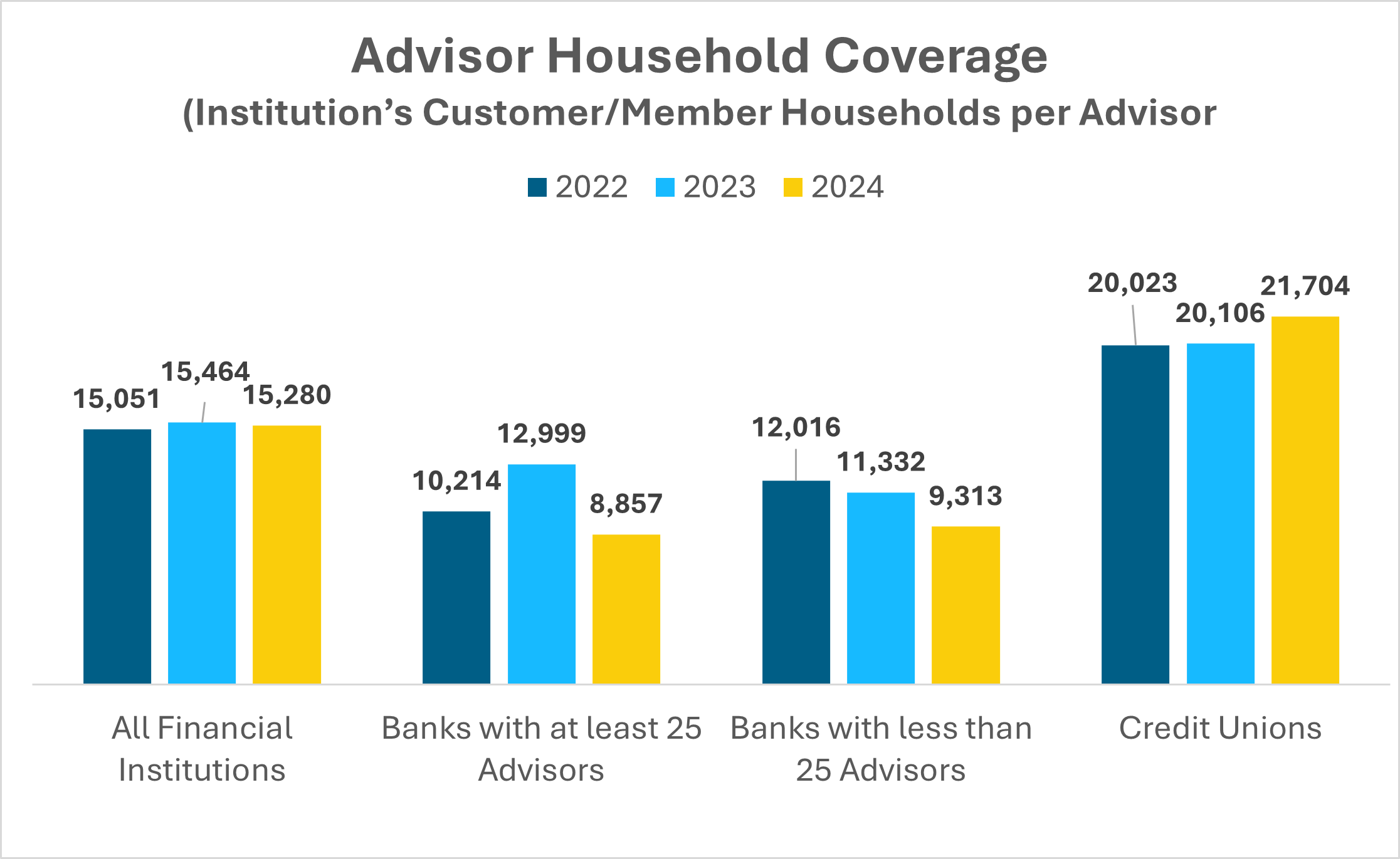 Banks of all sizes improved their advisor household coverage this past year, with the largest relative improvement in banks with at least 25 advisors – 32% thicker household coverage. Credit unions, which have much lower deposits per member household than deposits per bank customer household, saw their advisor household coverage thin out some.