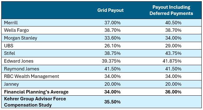 Every year Financial Planning obtains compensation plans from the national and regional brokerage firms and computes base compensation by applying a consistent product mix to each plan. This approximates what the “grid level” is at each production level across firms. (Standard year-end bonuses are noted as deferred payments.) They note that firms are continuing to squeeze the payouts of the bottom producers so that can increase payouts to top producers.